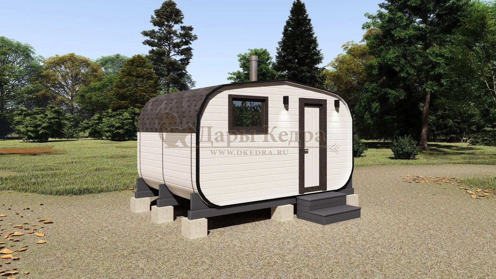 Баня-бочка «Орео» с боковым входом и панорамным окном Стильная и современная баня-бочка с боковым входом может быть выполнена длиною от 4 метров, что-бы было два отделения (парилка и комната отдыха). Полок может быть, как с двух сторон, так и угловой, в стандарте одноуровневый. Печь в данной модели расположена сбоку с топкой наружу, либо внутрь парилки. Печь можно укомплектовать баком для воды, а саму баню сделать длиною до 6 метров, комфортно разместив в ней дополнительно помывочную. В эту модель включено два закаленных стеклопакета: круглое и полукруг, которые мы можем разместить на ваше усмотрение в парилке и комнате отдыха. Обращаем Ваше внимание, по умолчанию в данной модели отсутствует бак для воды, вместо него идёт утеплённая термо-труба, которую можно заменить на бак по желанию.