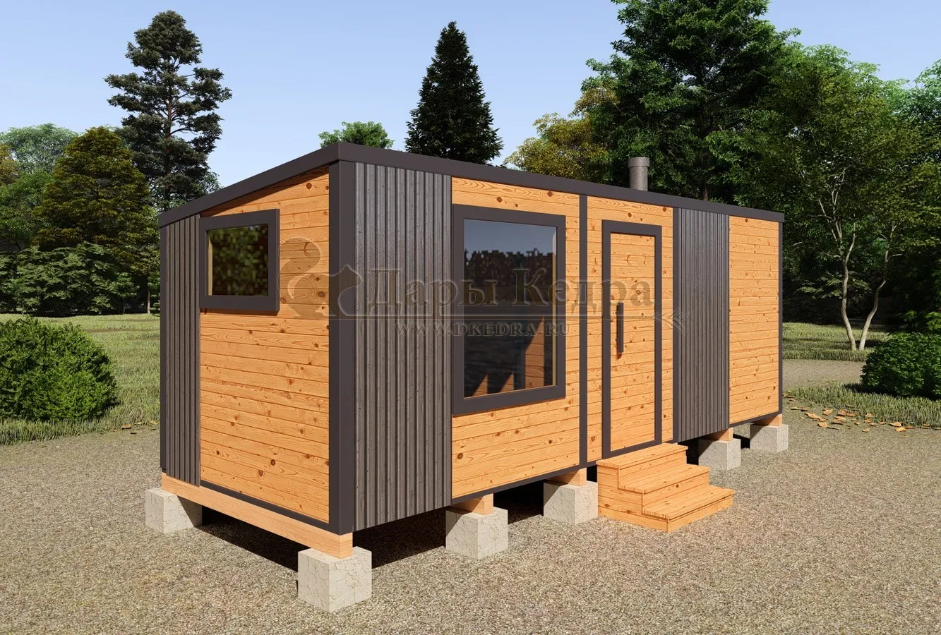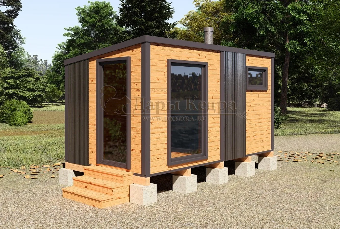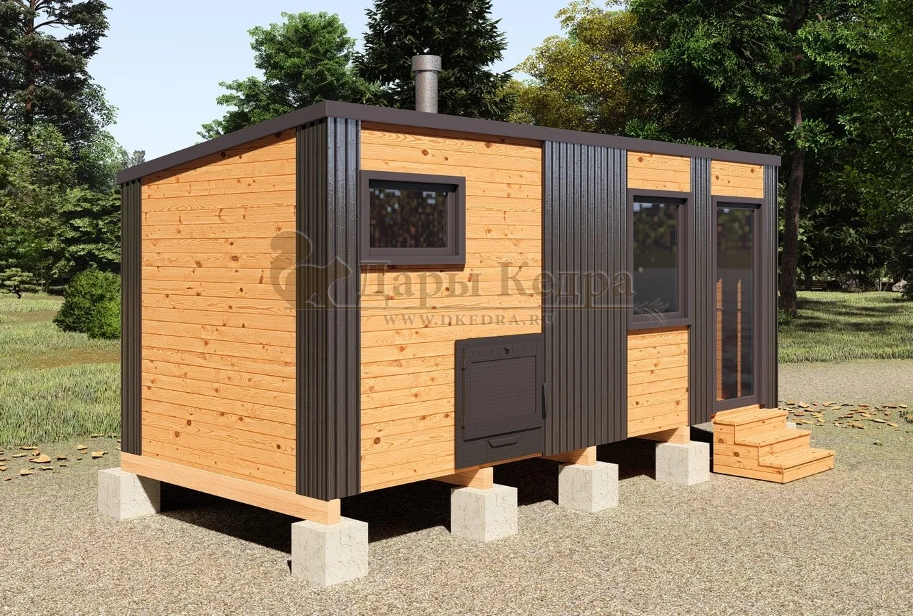Каркасная баня «Барн» из кедра 5х2,2 метра с боковым входом Каркасная баня 'Барн' из кедра длиной 5 метров – воплощение современного дизайна и функциональности. Этот компактный банный комплекс идеально впишется в ландшафт вашего участка, добавив ему элегантности и уюта. Минималистичный стиль 'барн' с его характерными чертами создает особую атмосферу, а продуманная планировка обеспечивает комфортное пребывание. Идеальное решение для тех, кто хочет получить максимум удовольствия от бани, не жертвуя пространством.