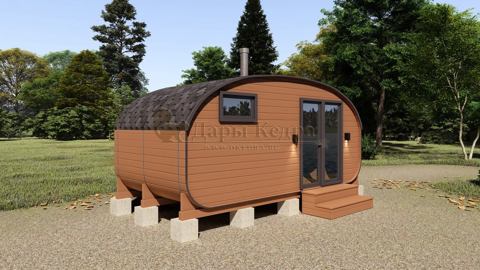 Баня-бочка круглая из кедра 2 метра Это изделие круглой вытянутой формы с одним парильным отделением. Внутреннее пространство включает в себя печь у дальней стены и лавки из кедра по обе стороны бани. За счет компактной формы баня нагревается в течение 30 минут. По вашему желанию ее можно укомплектовать козырьком, верандой и печью с внешней загрузкой, благодаря которой весь мусор после топки остается на улице. Круглая баня-бочка не требует полноценный фундамент, поэтому при необходимости ее можно перенести в другое место. Обращаем Ваше внимание, что в стандартную комплектацию бани входят лавки в парной с обеих сторон. Дополнительно можно заказать полок открытого или закрытого типа! Кедр обладает ароматическими свойствами. Он не деформируется и влагоустойчив, при правильном уходе за деревом на нем не развиваются грибки и плесень.