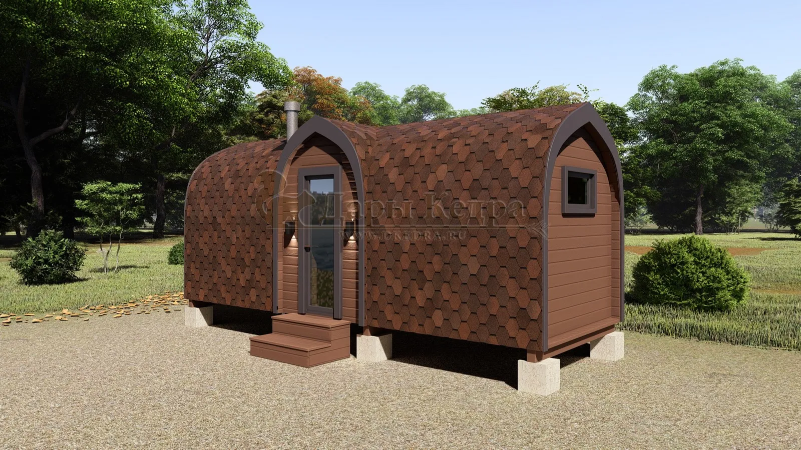 Баня-бочка «Пентагон» с панорамным окном Стильная и современная баня-бочка может быть выполнена длиною от 4 метров, с двумя отделениями (парилка и комната отдыха). Полок может быть, как с двух сторон, так и угловой, в стандарте двухуровневый. Печь в данной модели расположена сбоку с топкой внутрь парилки, либо наружу или в соседнее помещение. Печь можно укомплектовать баком для воды, а саму баню сделать длиною до 6 метров, комфортно разместив в ней дополнительно помывочную. Панорамное окно на входе добавит света и уюта в раздевалке. Установив баню в живописном месте, во время процедур можно наслаждаться видами из окна. В эту модель включено одно закаленное квадратное стекло в комнате отдыха. Обращаем Ваше внимание, по умолчанию в данной модели отсутствует бак для воды, вместо него идёт утеплённая термо-труба, которую можно заменить на бак по желанию.